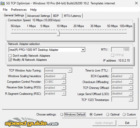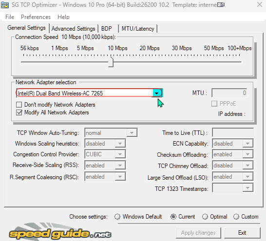 Ξεκινώντας από την καρτέλα General Settings του TCP Optimizer, βλέπουμε τις γενικές ρυθμίσεις. Ακολουθεί η καρτέλα Advanced Settings για τις πιο προχωρημένες επιλογές.
