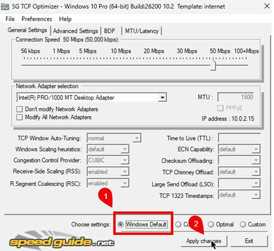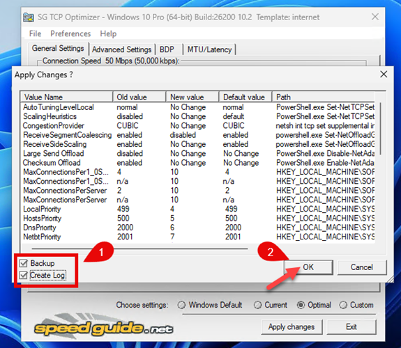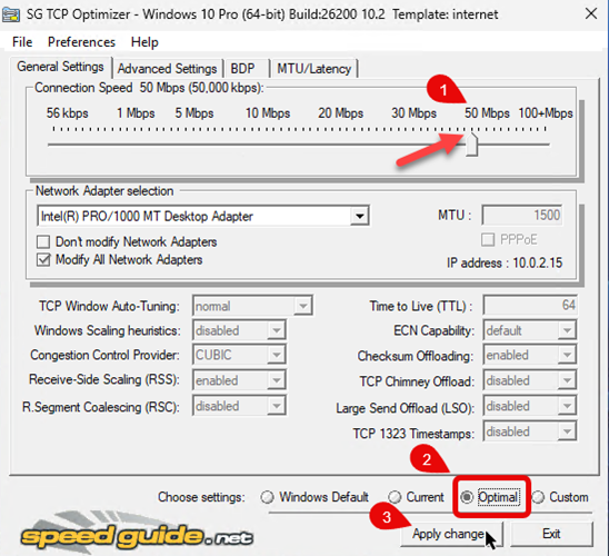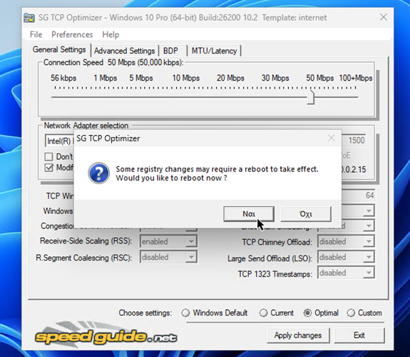 Έπειτα, κάνουμε κλικ στο “Optimal” από το κάτω μέρος του προγράμματος. Με αυτό το κουμπί, το πρόγραμμα ρυθμίζει αυτόματα τις βέλτιστες ρυθμίσεις για τη σύνδεσή μας. Μετά πατάμε “Apply changes“.