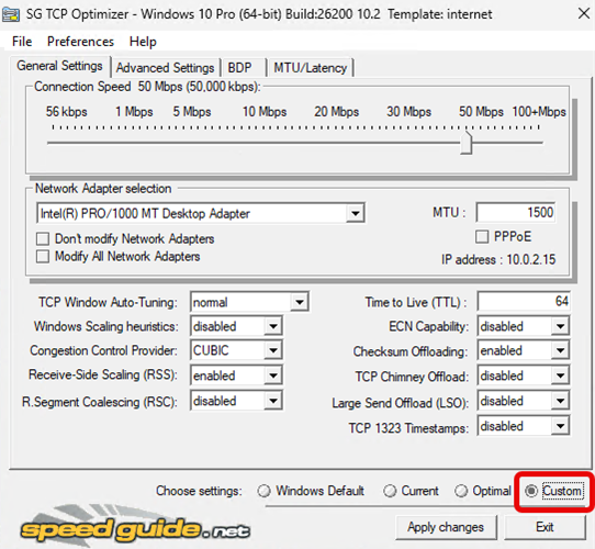 Για να μπορούμε να πειράξουμε οποιαδήποτε ρύθμιση χειροκίνητα για πιο γρήγορο ίντερνετ, θα πρέπει να επιλέξουμε το κουτάκι “Custom” από το κάτω μέρος του παραθύρου.