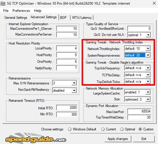 Στην καρτέλα των προχωρημένων ρυθμίσεων μπορούμε να εφαρμόσουμε αυτόματα διάφορες αλλαγές στο μητρώο των Windows, έτσι ώστε να βελτιωθούν οι επιδόσεις του δικτύου μας στα online παιχνίδια.