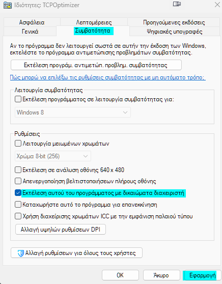 Φυσικά, μπορούμε πάντα να του ορίσουμε ευθύς εξαρχής να εκτελείται πάντα με δικαιώματα διαχειριστή, με δεξί κλικ και μετά μέσα από τις Ιδιότητες.