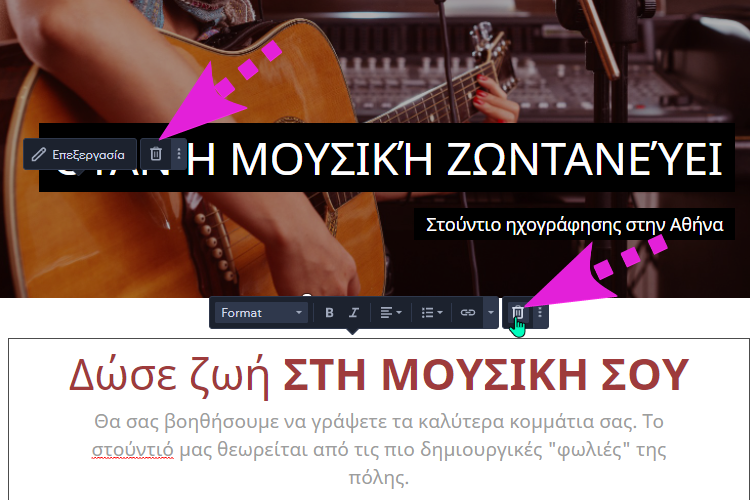 Σε στοιχεία που δεν είναι απαραίτητα, θα εμφανιστεί και ένας κάδος αχρήστων για να τα διαγράψουμε. Για παράδειγμα, μπορεί να μην θέλουμε κάποιες φωτογραφίες που εμφανίζονται. Σε γενικές γραμμές μπορούμε να αλλάξουμε εικόνες και κείμενο κατά το δοκούν.