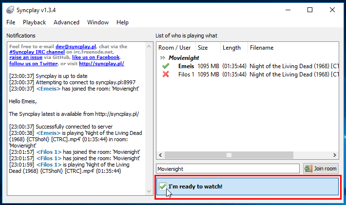 Στο βασικό παράθυρο του Syncplay υπάρχει μια επιλογή πως είμαστε έτοιμοι να ξεκινήσει η ταινία.
