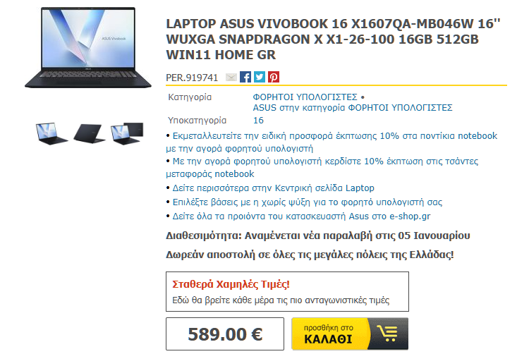 Asus Vivobook 16″/ Snapdragon X1: €589,-