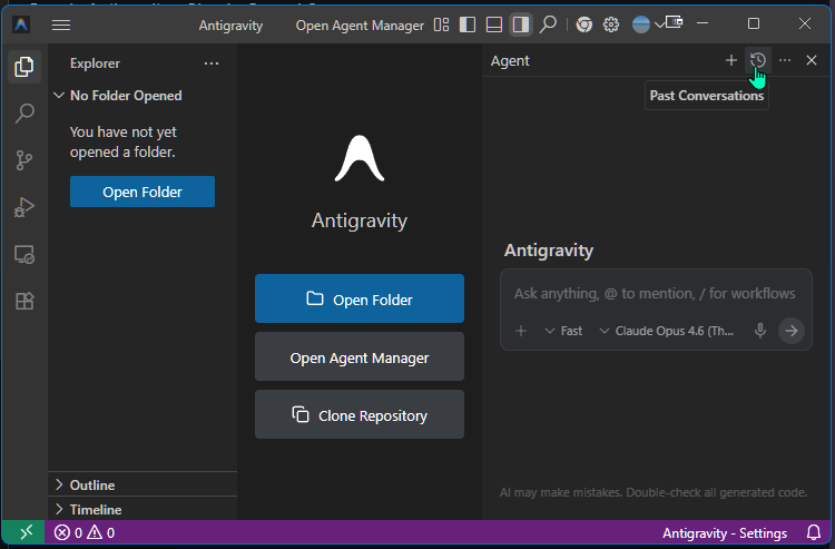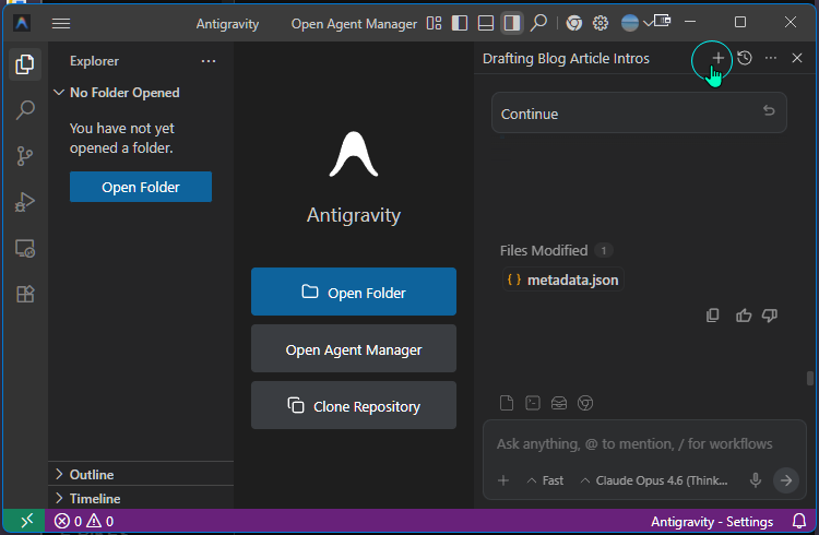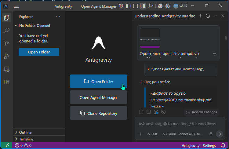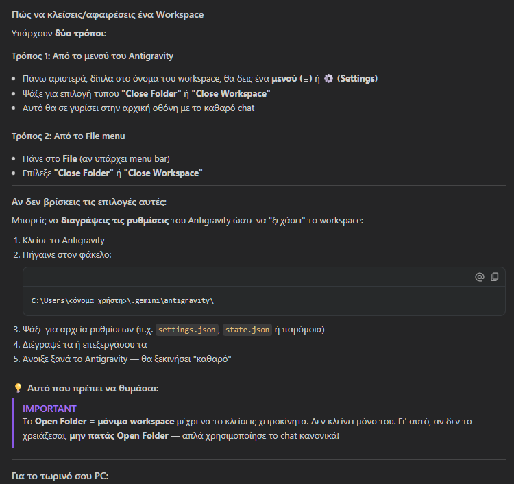 Καλό είναι να θυμόμαστε ότι η επιλογή Open Folder δημιουργεί αυτόματα το Workspace και ενδέχεται να εμφανίζεται μόνιμα μόλις θα ανοίγουμε το Antigravity, κάτι που ίσως μας προκαλέσει σύγχυση. Οπότε, καλό είναι στην αρχή να μείνουμε με τα βασικά, δηλαδή ανέβασμα αρχείου μέσω διαδρομής ή εντολής μας.