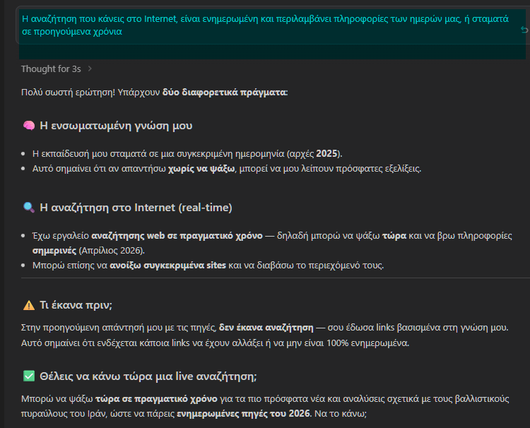 Όπως αναφέραμε, αν έχουμε ανοίξει νέο chat με το νέο βοηθό, περιγράφουμε το ίδιο ερώτημα, όλο από την αρχή. Αν παραμείναμε στην τρέχουσα συνομιλία αλλάζοντας μοντέλο, ζητάμε μόνο την επαλήθευση τον όσων μας είπε ο προηγούμενος βοηθός.