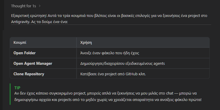 Σε γενικές γραμμές, μπορούμε ανά πάσα στιγμή να τον ρωτάμε για όλες τις υπόλοιπες ενδείξεις και κουμπιά που έχει το Google Antigravity, και θα μας εξηγεί αναλυτικά σε άπταιστα ελληνικά τι άλλο μπορούμε να κάνουμε με την εφαρμογή και τον AI agent.