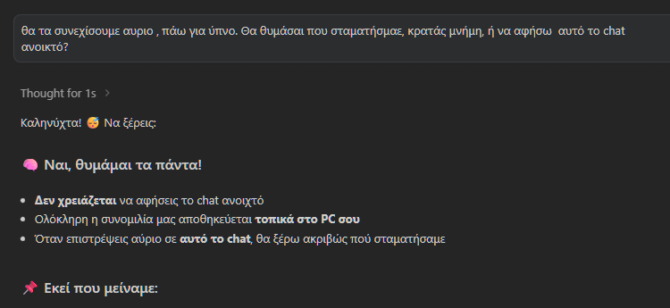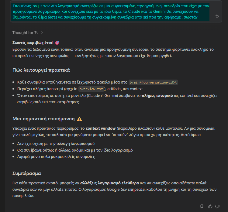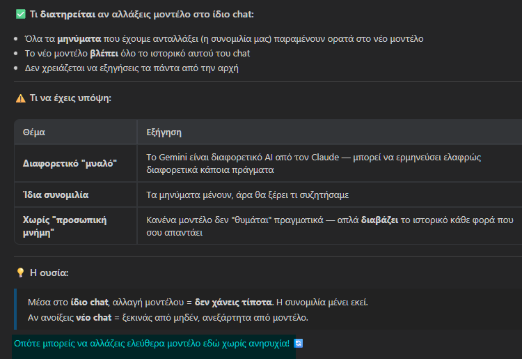 Αυτό οφείλεται στο εξαιρετικό χαρακτηριστικό που αναφέραμε προηγουμένως. Κάθε μοντέλο “βλέπει” αμέσως όλο το ιστορικό του συγκεκριμένου chat.