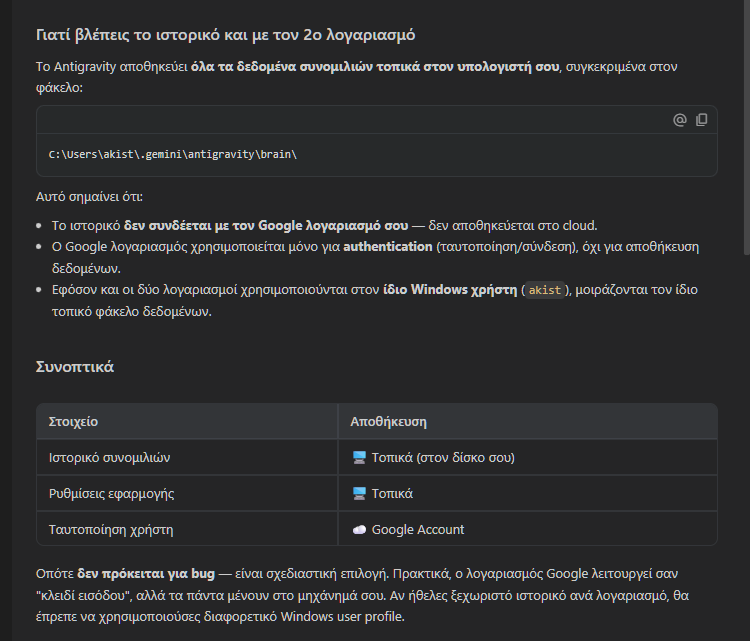 Όλες οι συνομιλίες μας στο Google Antigravity αποθηκεύονται τοπικά. Αρκεί να ρωτήσουμε τον AI agent να μας υποδείξει ακριβώς τη διαδρομή του αρχείου στο σύστημα μας.