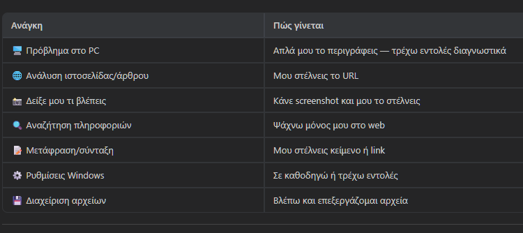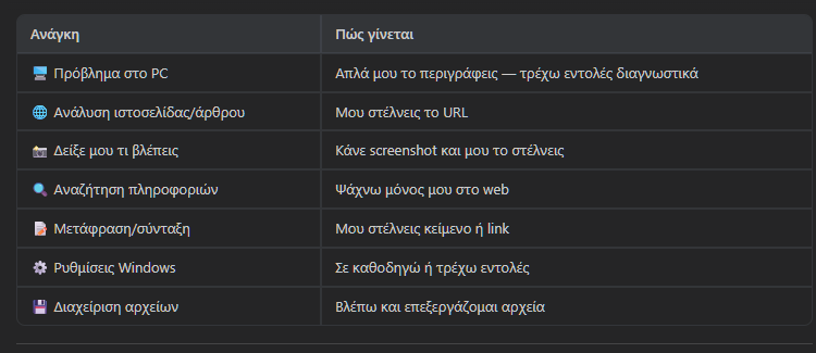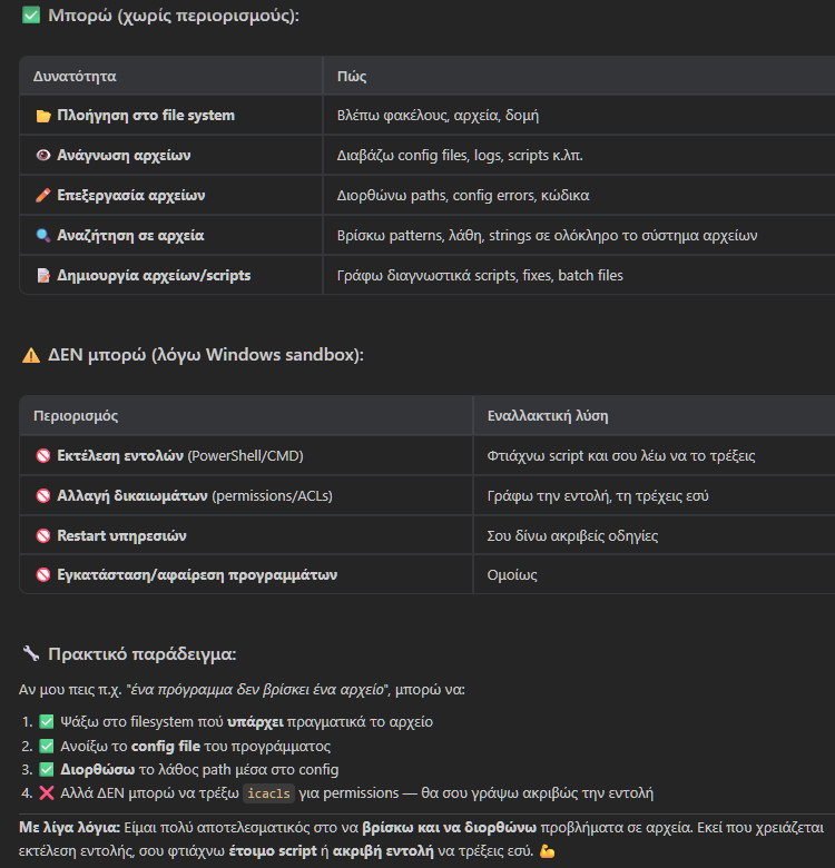 Για να μην υπάρξει τυχόν παρερμηνεία, δεν είναι ο μάγος που θα μας φτιάξει τα Windows με ένα κλικ — αλλά είναι το πιο κοντινό πράγμα σε AI συνεργάτη που γράφει, δοκιμάζει και εκτελεί λύσεις αντί για εμάς. Και πάντα με βάση τις οδηγίες μας.