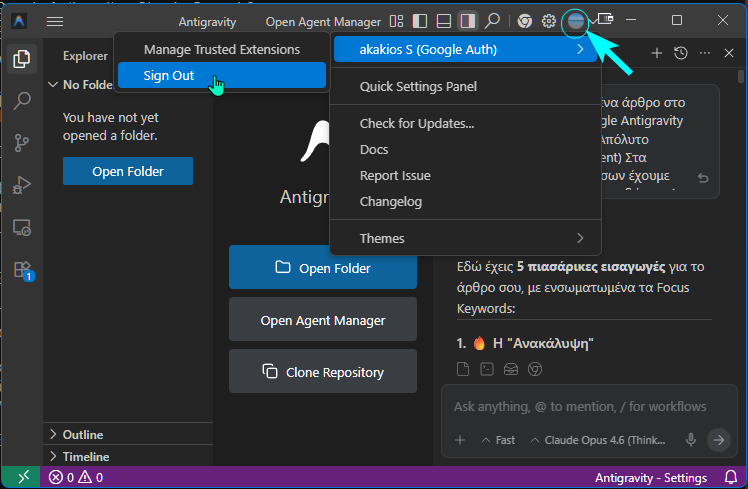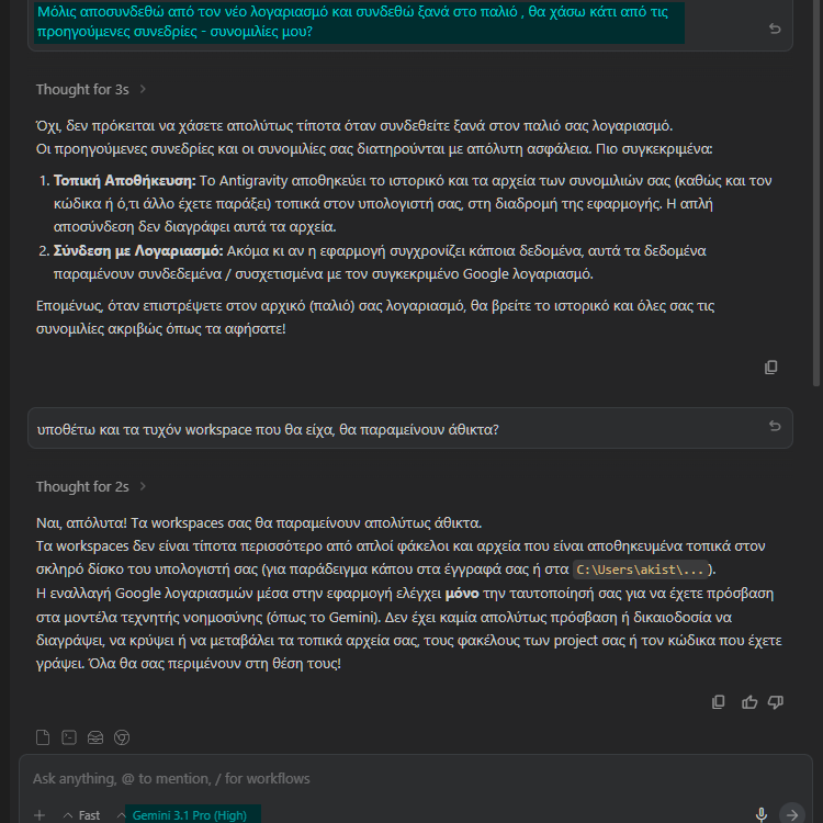 Το καλύτερο είναι ότι το ιστορικό μας, δηλαδή όλες οι συνομιλίες μας και όλα τα τυχόν workspaces που έχουμε δημιουργήσει, διατηρούνται ανέπαφα ακόμη και αν αλλάξουμε τον Google λογαριασμό μας στο Antigravity. Δηλαδή να αποσυνδεθούμε και συνδεθούμε με κάποιο άλλο λογαριασμό που διατηρούμε.