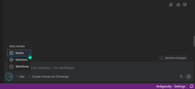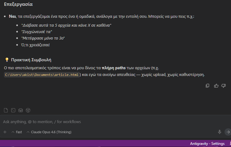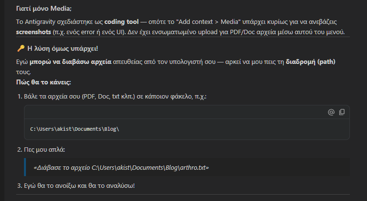 Μπορούμε να ανεβάσουμε όσα αρχεία θέλουμε, δεν υπάρχει ο συνήθης περιορισμός που συναντάμε στα chatbots στον browser, καθώς όπως είπαμε το Antigravity έχει άμεση πρόσβαση στο τοπικό σύστημα αρχείων μας (filesystem).