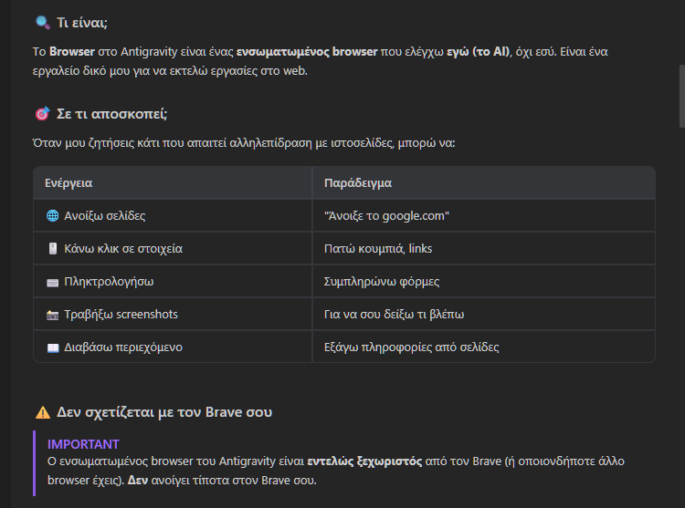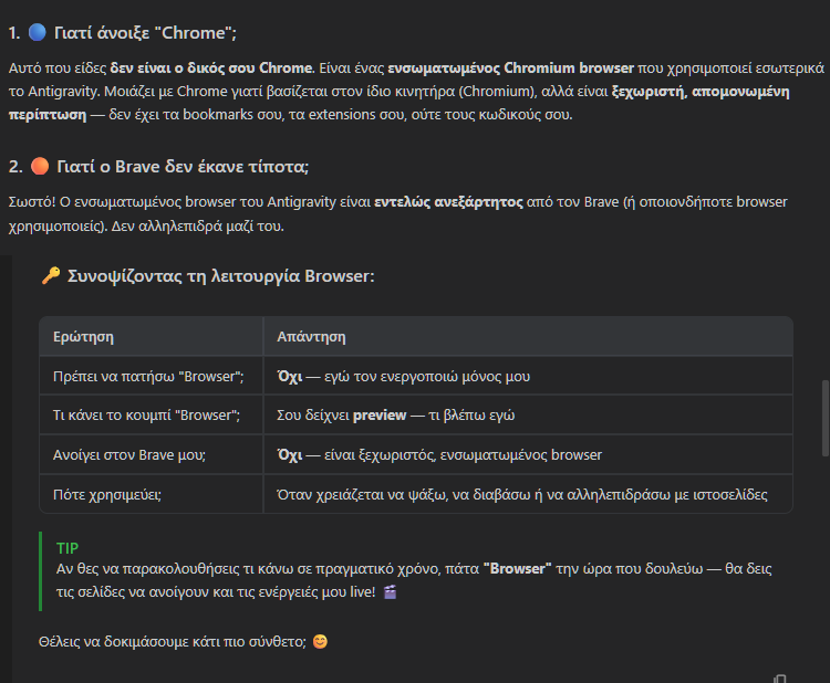 Έτσι, αν για κάποιο λόγο βλέπουμε αυτόν τον browser, απλά τον αφήνουμε να ολοκληρώσει τις εργασίες που του έχει αναθέσει ο agent. Έτσι και αλλιώς, το Antigravity θα μας καθοδηγεί σχετικά.