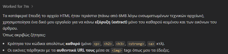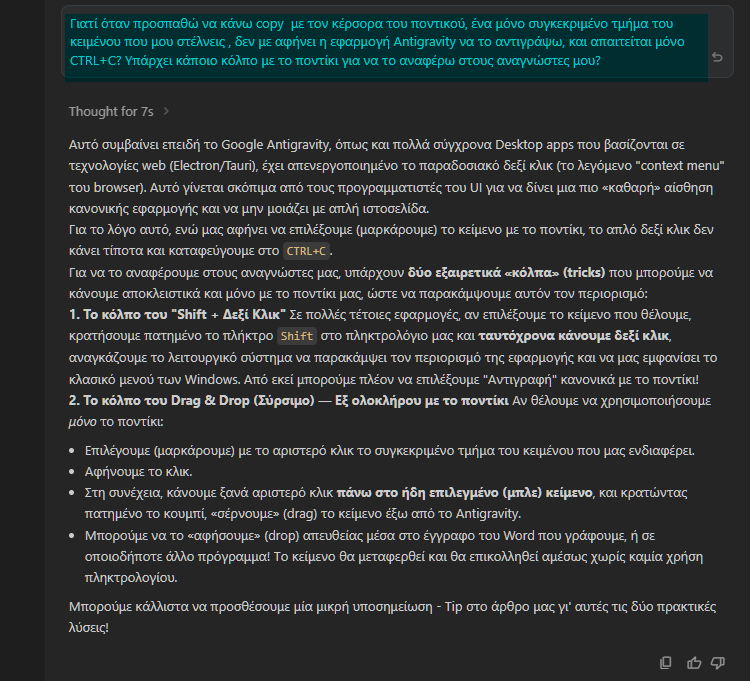 Τέλος, θα παρατηρήσουμε πως όταν προσπαθούμε με τον κέρσορα του ποντικού να κάνουμε copy ένα μόνο συγκεκριμένο τμήμα του κειμένου που μας στέλνει ο AI agent, δεν μας αφήνει η εφαρμογή Antigravity να το αντιγράψουμε. Απαιτείται το ταυτόχρονο πάτημα Ctrl+C στο πληκτρολόγιο.