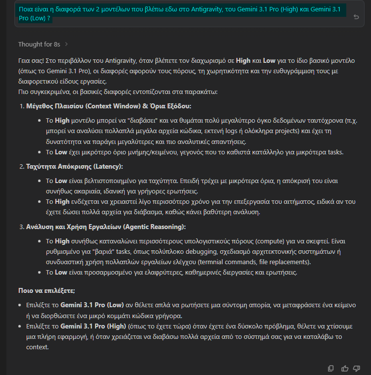 Σε ό,τι αφορά τα δύο premium μοντέλα Gemini, η διαφορά μεταξύ του Gemini 3.1 Pro (High) και Gemini 3.1 Pro (Low), είναι αυτή που μας εξηγεί αναλυτικά το Google Antigravity στο κάτωθι στιγμιότυπο: