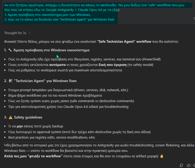Όταν εξοικειωθούμε με το Google Antigravity και τις λειτουργίες του, εφόσον το επιθυμούμε μπορούμε να πάμε ακόμη παραπέρα, και να του πούμε να μας φτιάξει ένα αναλυτικό Safe Agent workflow.