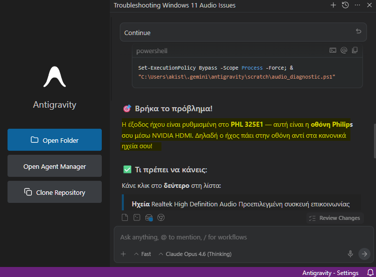 Στο συγκεκριμένο παράδειγμά μας, μετά την περιγραφή του προβλήματος ήχου, ο AI agent μας άνοιξε ο ίδιος το παράθυρο της σχετικής ρύθμισης των Windows για να δούμε από μόνοι μας τι μπορεί να φταίει. Ταυτόχρονα, αυτός συνέχισε να εργάζεται εκτελώντας διαγνωστικά και εξηγώντας στην οθόνη τι ακριβώς κάνει για τη διάγνωση του προβλήματος.