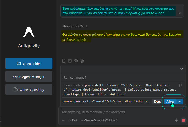 Ο AI agent αμέσως θα ξεκινήσει τη διαδικασία διάγνωσης. Προσέχουμε μόνο να του παρέχουμε την άδεια να μπαίνει βαθύτερα στο σύστημα μας, πατώντας στα μπλε Allow που θα εμφανίζονται, όπως παρατηρούμε στο παραπάνω στιγμιότυπο.