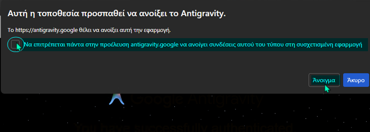 Τέλος, μετά την επιτυχή είσοδο, θα μας ανοίξει η σχετική ειδοποίηση στον browser για να επιτρέψουμε μόνιμα την πρόσβαση στο dashboard του Google Antigravity…