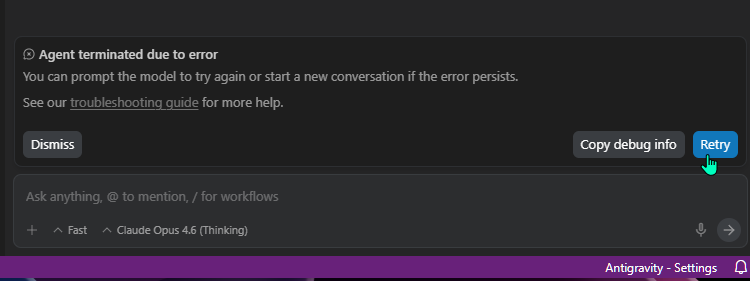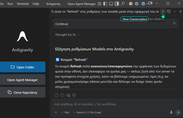 Ενδέχεται κάποιες στιγμές, να βλέπουμε ότι ο AI agent καθυστερεί πολύ και έχει κολλήσει στο Generating ή κάτι σχετικό. Σε τέτοιες περιπτώσεις, απλά πατάμε στο εικονίδιο του Stop κάτω δεξιά στο chatbox, και επανεκκινούμε την εφαρμογή του Google Antigravity.