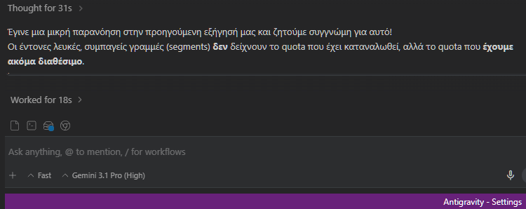 Παρότι δεν ανοίξαμε νέο chat, αλλάζοντας μόνο το μοντέλο σε Gemini 3.1 Pro (High), ο βοηθός της Google έσπευσε να απολογηθεί για το λάθος που είχε κάνει το Claude σχετικά με τη συγκεκριμένη λειτουργία του Quota στο Antigravity.