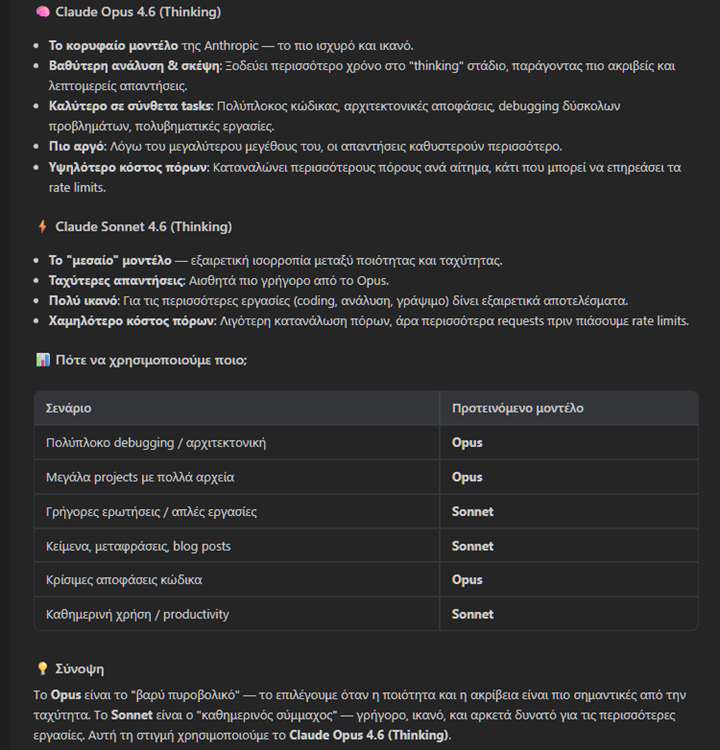 Παρομοίως, τη διαφορά μεταξύ του Claude Opus 4.6 (Thinking) και Claude Sonnet 4.6 (Thinking) μας την περιγράφει αναλυτικά το Antigravity στο κάτωθι στιγμιότυπο. Όπως παρατηρούμε, δεν είναι πάντα αναγκαίο να αξιοποιούμε μόνο το Opus 4.6 αν τα προβλήματα ή οι εργασίες μας δεν αφορούν σύνθετα ζητήματα.