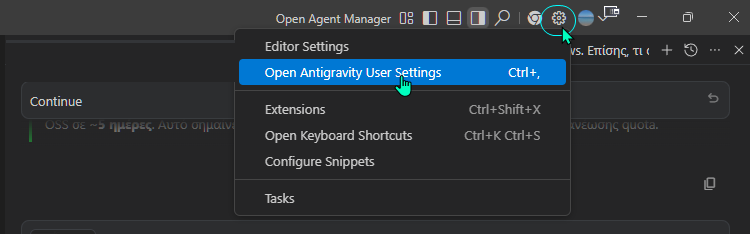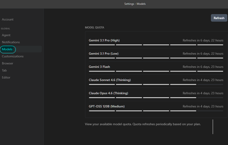 Μπορούμε να βλέπουμε το quota που έχουμε ακόμα διαθέσιμο, μέσα από τις ρυθμίσεις της εφαρμογής: Open Antigravity User Settings > Models;