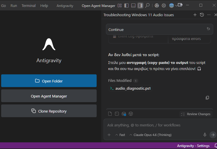 Έτσι, σε οποιαδήποτε ζήτημα αντιμετωπίζουμε, το Google Antigravity τροφοδοτούμενο από το Claude και το Gemini, θα μας διορθώνει τα σφάλματα αναλύοντας το σύστημά μας σε πραγματικό χρόνο.