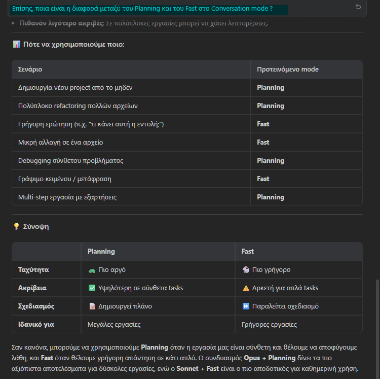 Τέλος, σε ό,τι αφορά τη διαφορά μεταξύ του Planning και του Fast στο Conversation mode που βλέπουμε στο chatbox…