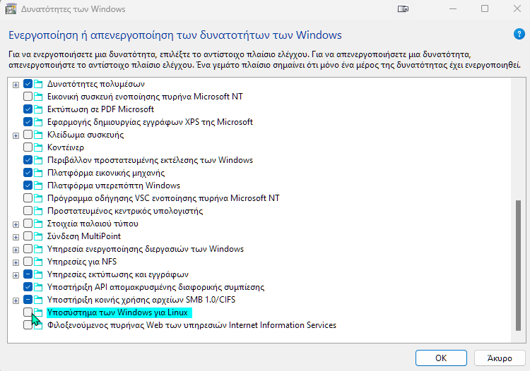 Στο παράθυρο που θα μας ανοίξει, τσεκάρουμε το κουτάκι που αντιστοιχεί στο Υποσύστημα των Windows για Linux. Μετά, πατάμε στο OK.