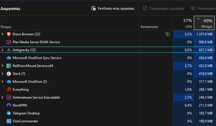 Η «σκέψη» γίνεται στους servers της Google και της Anthropic στο cloud, ενώ εμείς απλώς αλληλεπιδρούμε μέσω μιας σχετικά ελαφριάς desktop εφαρμογής. Αν ένας browser με 4-5 tabs μπορεί να ξεπεράσει το 1GB RAM, τότε τα ~600MB του Antigravity μόνο βαριά δεν τα λες.