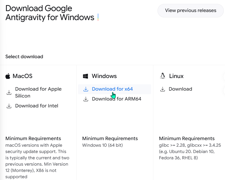 Το Google Antigravity το κατεβάζουμε από εδώ. Το αρχείο λήψης στα Windows είναι περί τα 230MB. Το συνολικό μέγεθος μετά την εγκατάσταση κυμαίνεται στο 1GB. Όπως βλέπουμε, διατίθεται και για MacOS και Linux.