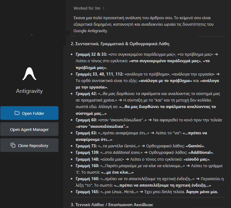 Θα λέγαμε ότι και σε αυτό το θέμα της ανάλυσης κειμένου, οι agents του Antigravity δεν συγκρίνονται με τα δημοφιλή chatbots στον browser. Υπερτερούν σε όλα τα πεδία. Ενδέχεται να είναι καλύτεροι και από τις συνδρομητικές εκδόσεις των online βοηθών.