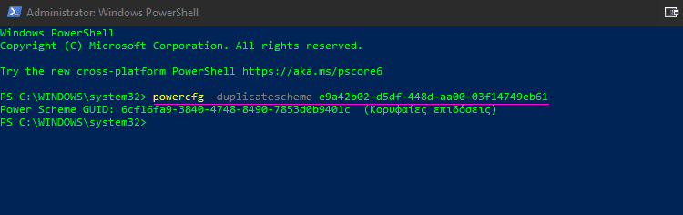 powercfg -duplicatescheme e9a42b02-d5df-448d-aa00-03f14749eb61
