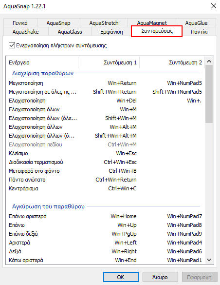 Η καρτέλα Συντομεύσεις αφορά την ενεργοποίηση πλήκτρων συντόμευσης.