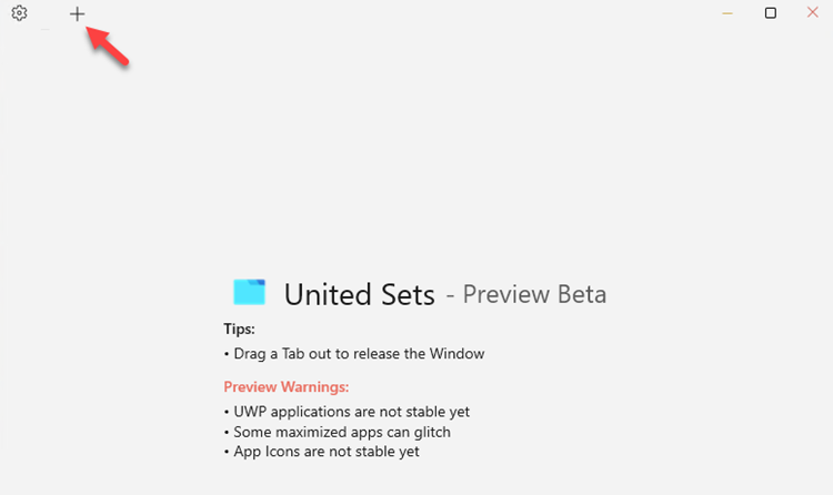Έτσι, με το United Sets ανοιχτό, η προσθήκη οποιουδήποτε παραθύρου εφαρμογής ως καρτέλα, είναι εξαιρετικά απλή. Αρχικά, κάνουμε κλικ στο εικονίδιο “+” στην επάνω αριστερή γωνία για να ξεκινήσουμε.