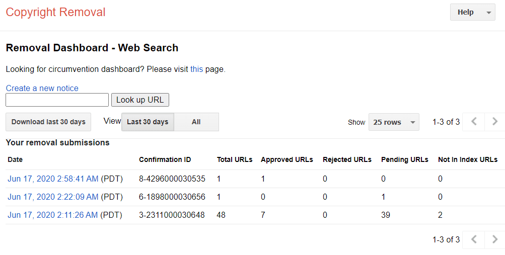Στο Rejected URLs θα βάλει η Google τις διευθύνσεις που θα κρίνει πως δεν υπήρχε αντιγραφή. Αυτό δεν σημαίνει απαραίτητα πως έχουμε κάνει λάθος, μπορεί η σελίδα απλά να κατέβηκε κάποια στιγμή αφότου κάναμε την καταγγελία.