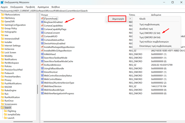 Έπειτα, κάνουμε δεξί κλικ στον κενό χώρο, επιλέγουμε “Δημιουργία → Τιμή DWORD (32-bit)”, και ονομάζουμε τη νέα τιμή “BingSearchEnabled”.