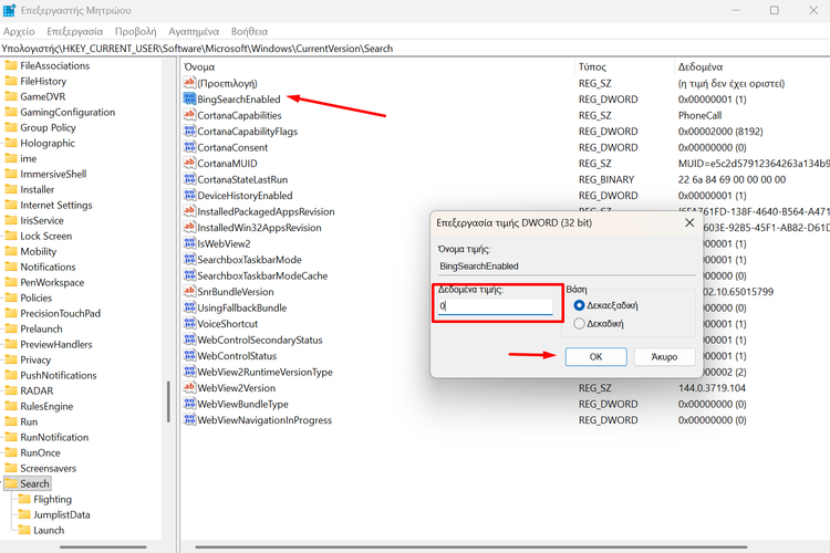 Μετά, κάνουμε διπλό κλικ στο “BingSearchEnabled”, στα “Δεδομένα τιμής” πληκτρολογούμε “0”, και πατάμε το “ΟΚ”.