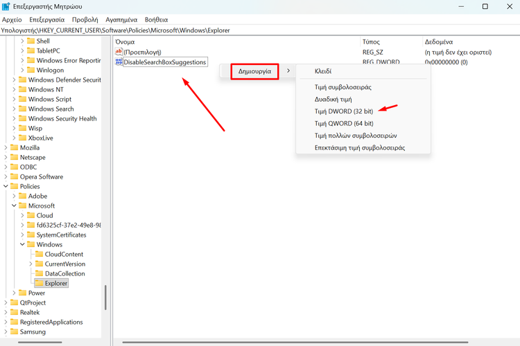 Έπειτα, κάνουμε δεξί κλικ στον κενό χώρο, επιλέγουμε “Δημιουργία → Τιμή DWORD (32-bit)”, και ονομάζουμε τη νέα τιμή “DisableSearchBoxSuggestions”.
