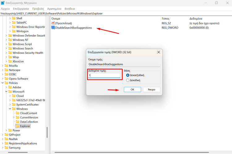 Μετά, κάνουμε διπλό κλικ στο “DisableSearchBoxSuggestions”, στα “Δεδομένα τιμής” πληκτρολογούμε “1”, και πατάμε το “ΟΚ”.