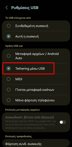 Έπειτα, συνδέουμε το κινητό με τον υπολογιστή μέσω καλωδίου USB και ενεργοποιούμε τη λειτουργία “USB tethering” από τις ρυθμίσεις της εφαρμογής στο κινητό.