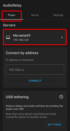 Μετά, στο κινητό, μεταβαίνουμε στην καρτέλα “Player” και πατάμε πάνω στο όνομα του υπολογιστή, για να ξεκινήσει η μετάδοση του ήχου.