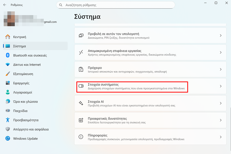 Στη συνέχεια, επιλέγουμε το “Στοιχεία συστήματος”.