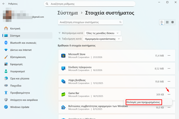 Μετά, πατάμε τις τρεις τελείες δίπλα στο “Game Bar” και κάνουμε κλικ στο “Επιλογές για προχωρημένους”.