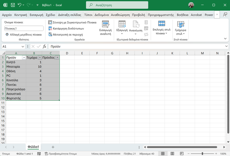 Αρχικά, μετατρέπουμε τα δεδομένα σε πίνακα επιλέγοντας τα και πατώντας “Ctrl + T”, ώστε οι τύποι να επεκτείνονται αυτόματα στις νέες σειρές.