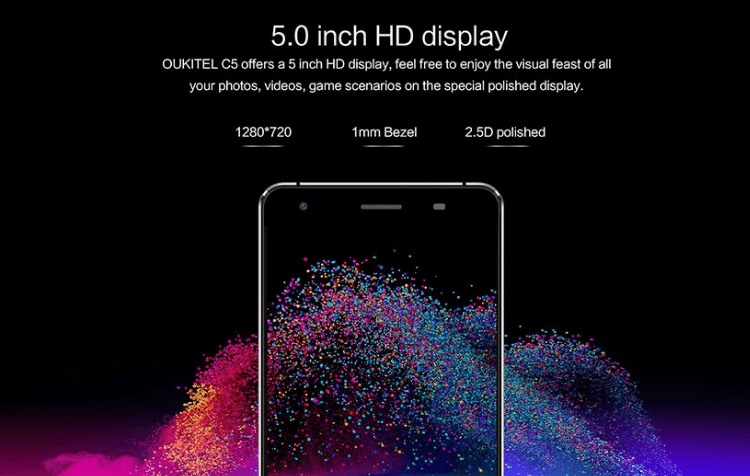 Το Oukitel C5 διακρίνεται όπως είδαμε για την πολύ φθηνή τιμή του. Έχει οθόνη 5.0 ιντσών με μικρά περιθώρια, ανάλυσης 1280 x 720 pixels.