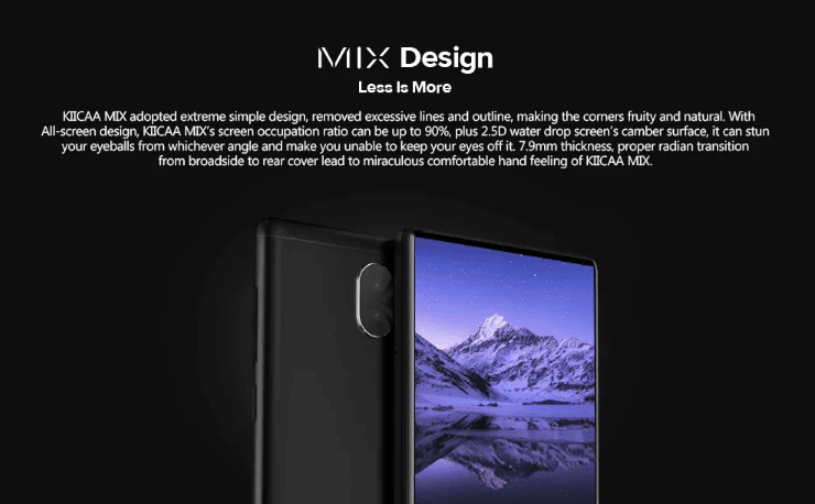 Το Leagoo KIICAA MIX 4G έχει μεγάλη οθόνη υψηλής ανάλυσης από την Ιαπωνική Sharp με Corning Gorilla Glass 4, και 90% Screen-to-body Ratio. Έχει όμορφη εμφάνιση με μικρό πάχος (7,9 mm) και τρέχει το Android 7.0.