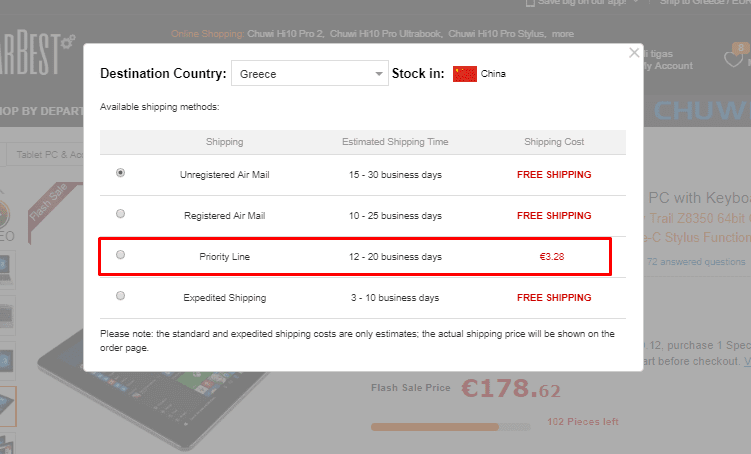 Ενώ υπάρχει δωρεάν αποστολή, ο ενδεδειγμένος τρόπος αποστολής που είναι 100% αποτελεσματικός στο να γλιτώσουμε το τελωνείο είναι η επιλογή Priority Line στα €3.28, την οποία θα βρούμε αποκλειστικά στο GearBest. Το laptop θα έρθει στο σπίτι μας με courier.