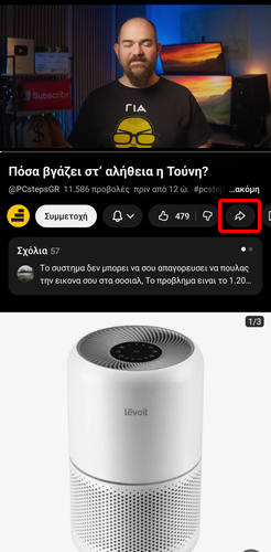 Έπειτα, ανοίγουμε το βίντεο που θέλουμε να κατεβάσουμε στην αντίστοιχη εφαρμογή, για παράδειγμα στο YouTube, και πατάμε το κουμπί της κοινοποίησης.